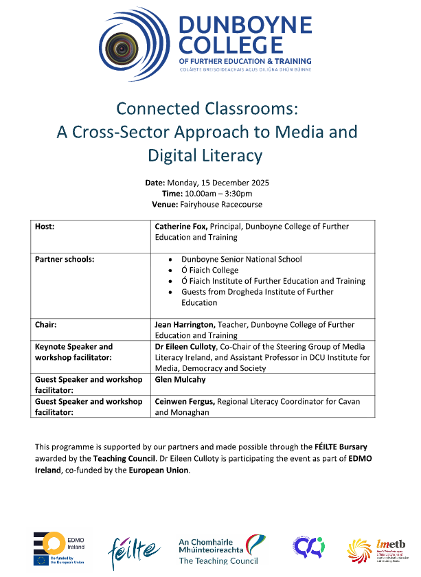EDMO Ireland coordinator Dr Eileen Culloty was invited to deliver a keynote address at a training day hosted by Dunboyne College of Further Education. The event, titled Connected Classrooms: A Cross-Sector Approach to Media and Digital Literacy, brought together educators to explore how media and digital literacy can be embedded across teaching and learning.