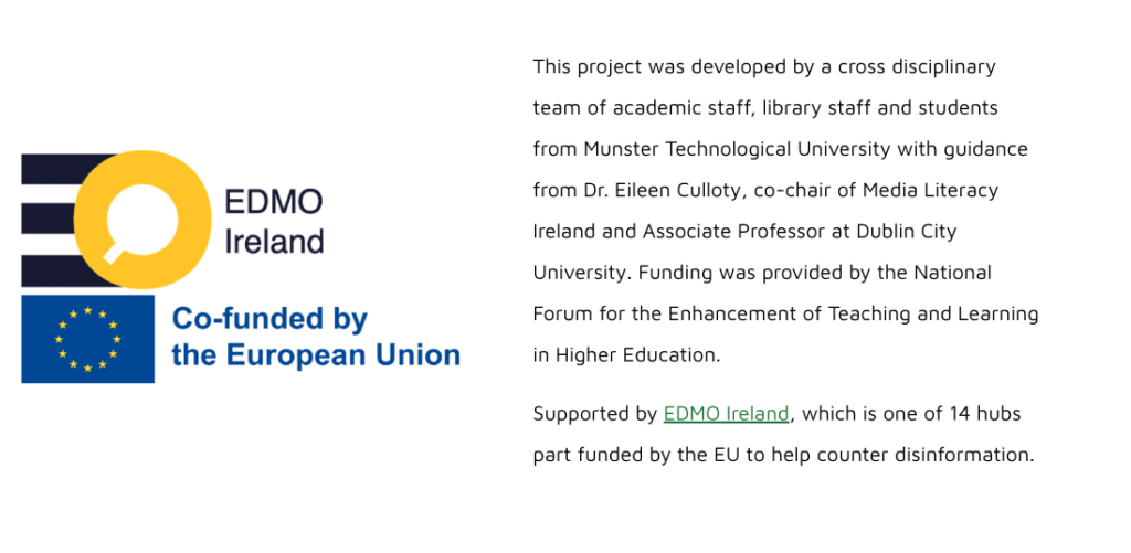 Developed by a cross-disciplinary team of academic staff, library professionals, and students from Munster Technological University, with guidance from EDMO Ireland, the resource addresses the growing need for media literacy skills in higher education. Funding for the project was provided by the National Forum for the Enhancement of Teaching and Learning in Higher Education.